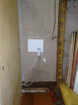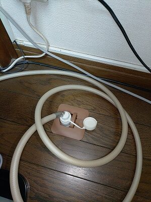 壁に穴を開けて、コンセントと外から回したガス管を接続。コンセントを壁に固定して室内は完了です。