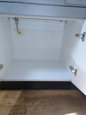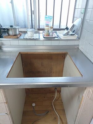 今回の工事は、ビルトインコンロの交換工事ですが、ビルトインコンロの下にオーブンレンジがついていて、そのオーブンレンジも撤去して収納に変更する工事です。